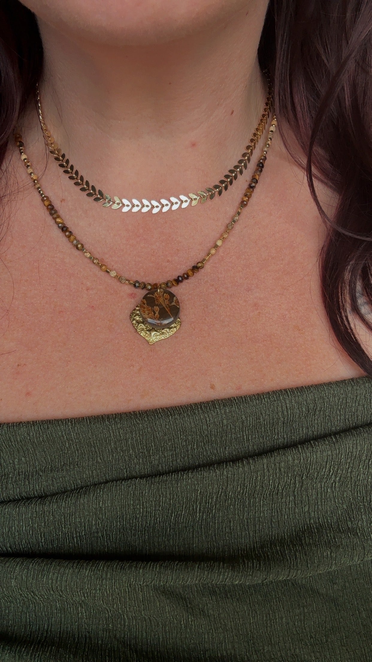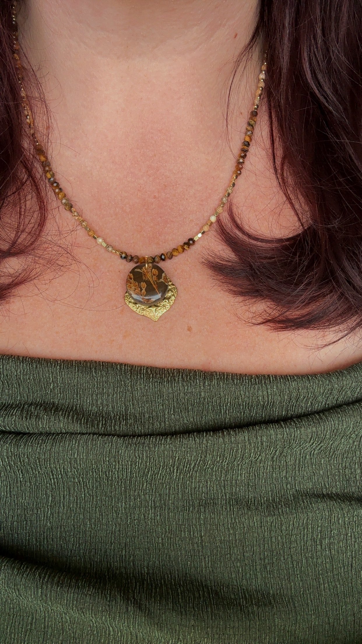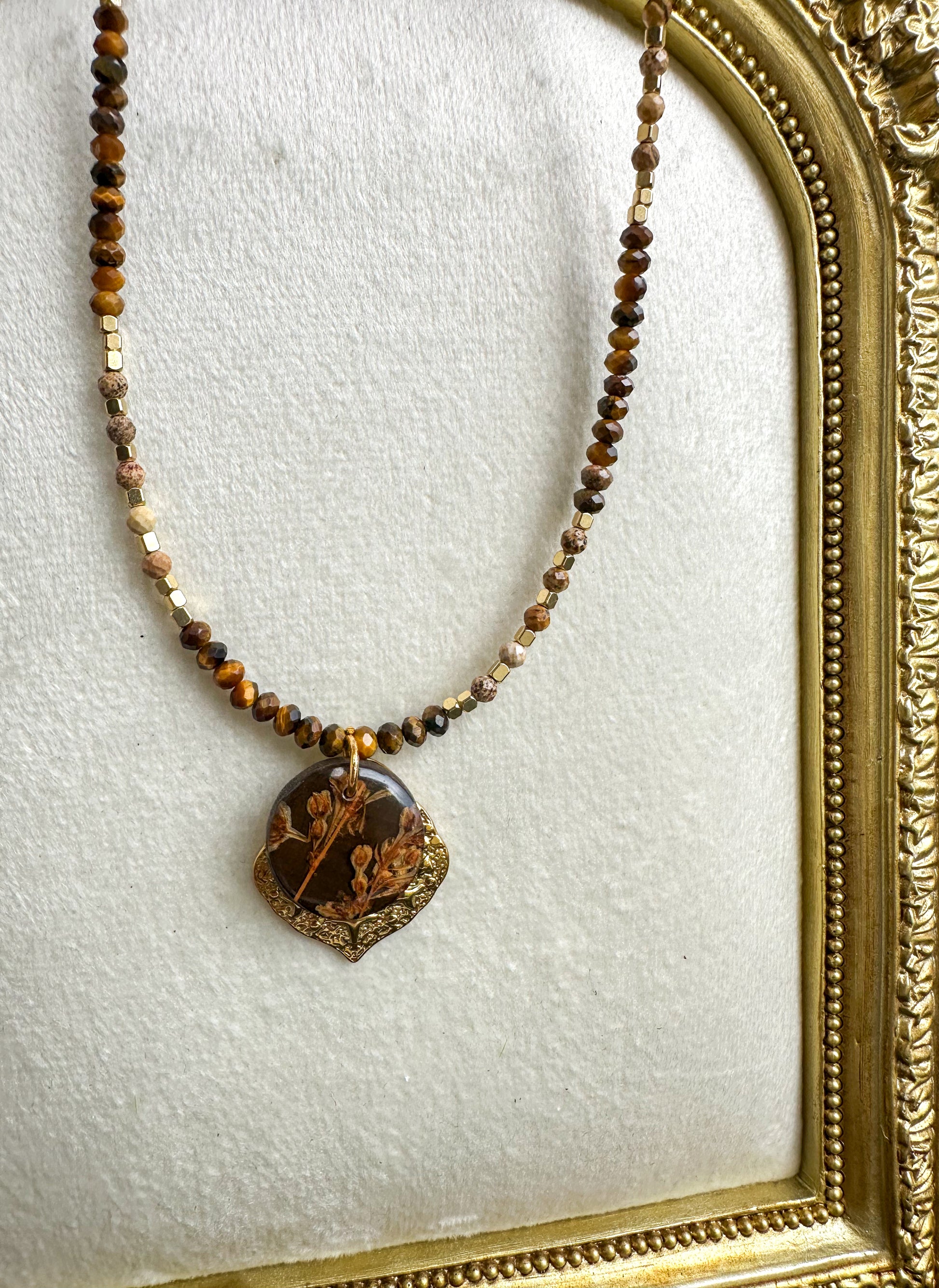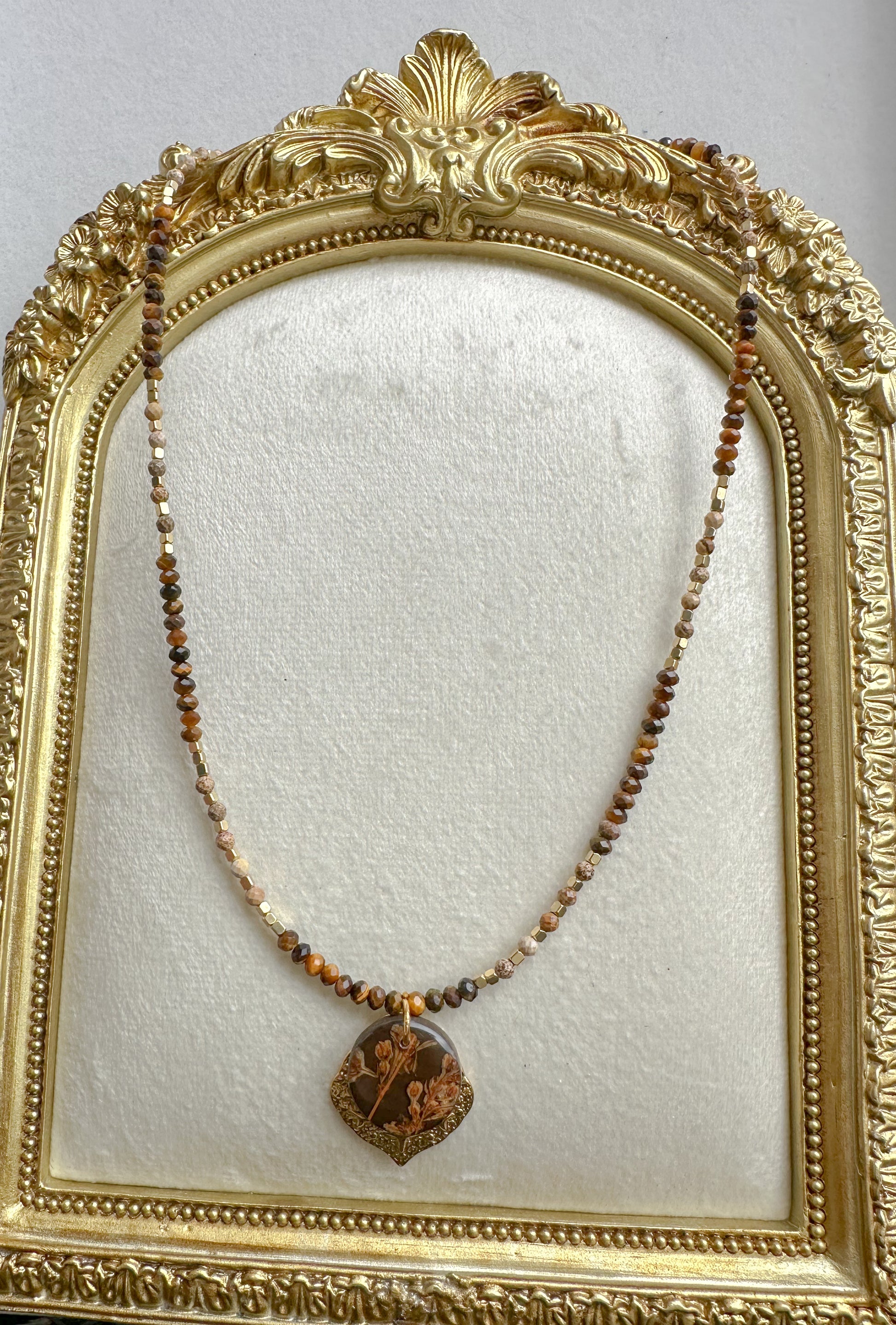 Warm golden-brown beads with a botanical pendant framed in gold. A nature lover’s treasure