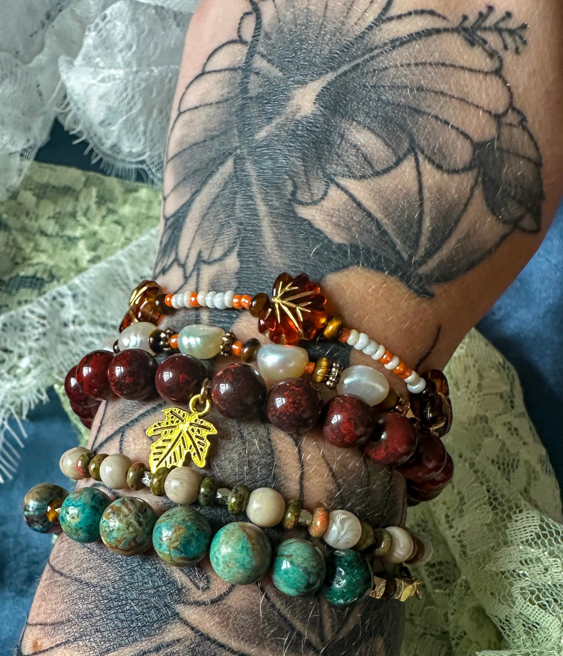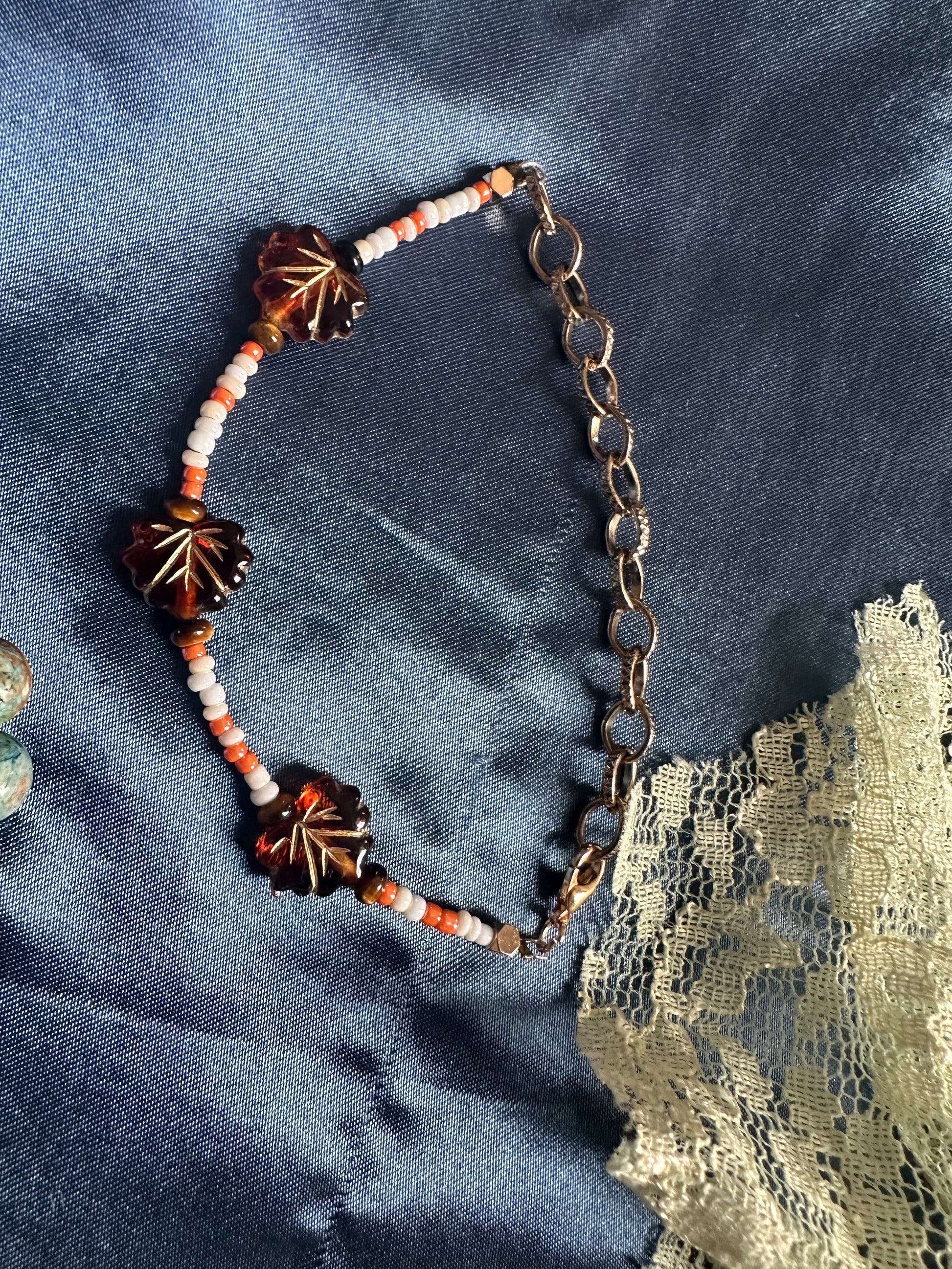 Amber toned glass leaves and warm beads that capture the glow of fall.
