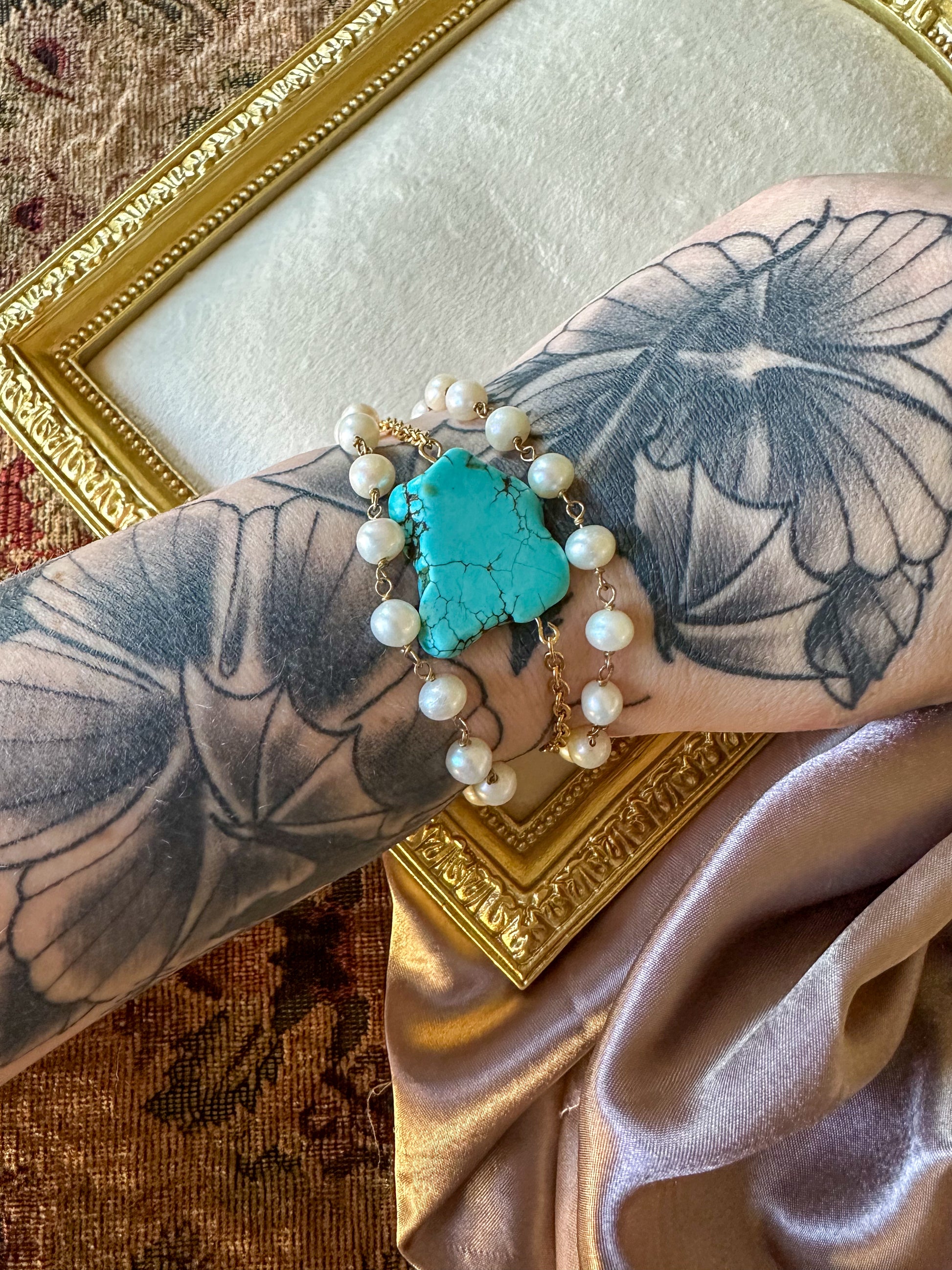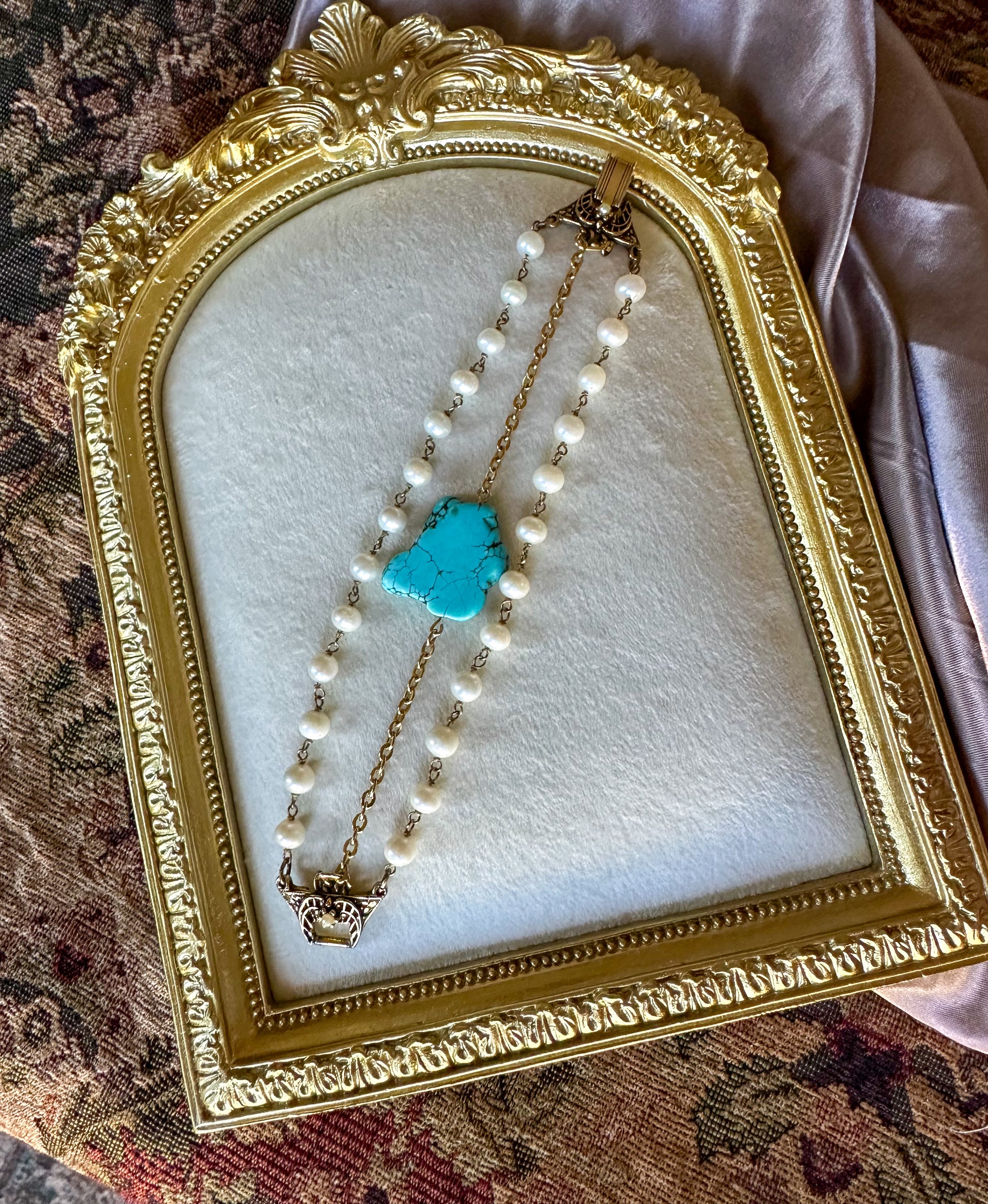 Turquoise centerpiece framed by pearls and vintage brass, equal parts grace and grit. She’s Sunday morning gentle with Saturday night fire.