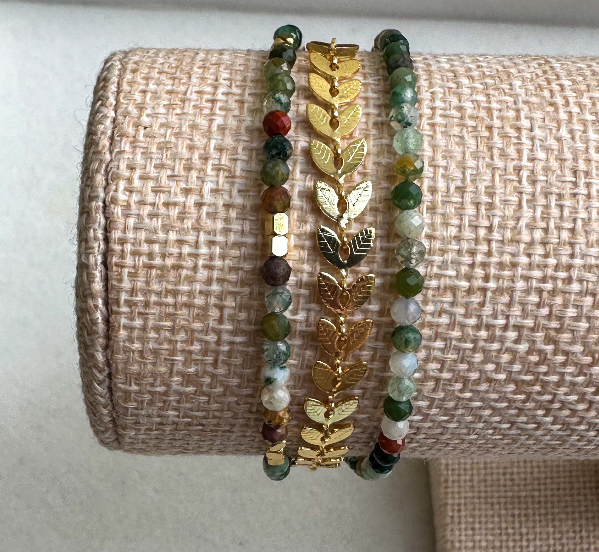 Multi-strand bracelet of gold leaves and gemstone beads, woven together with ornate connectors.