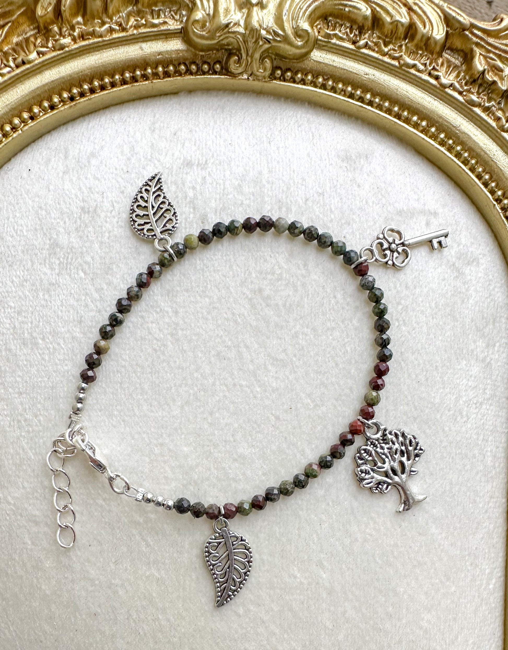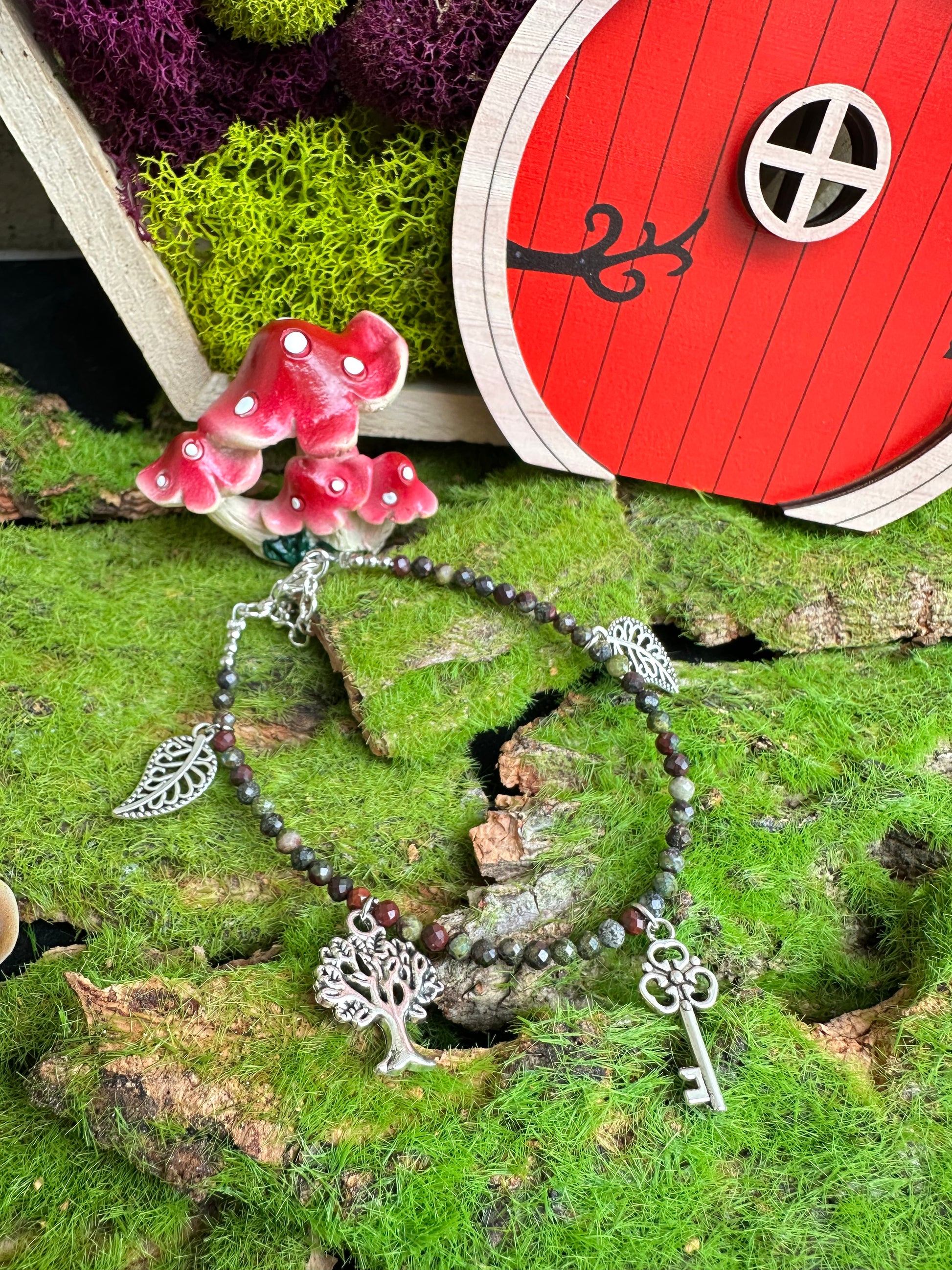 Beaded bracelet with silver leafs, tree and a magic key, carrying the whisper of ancient woods
