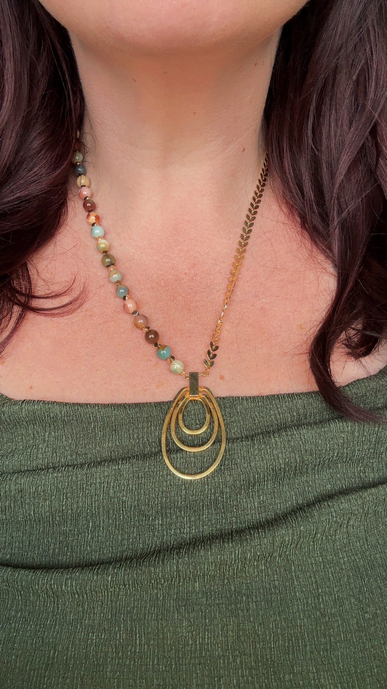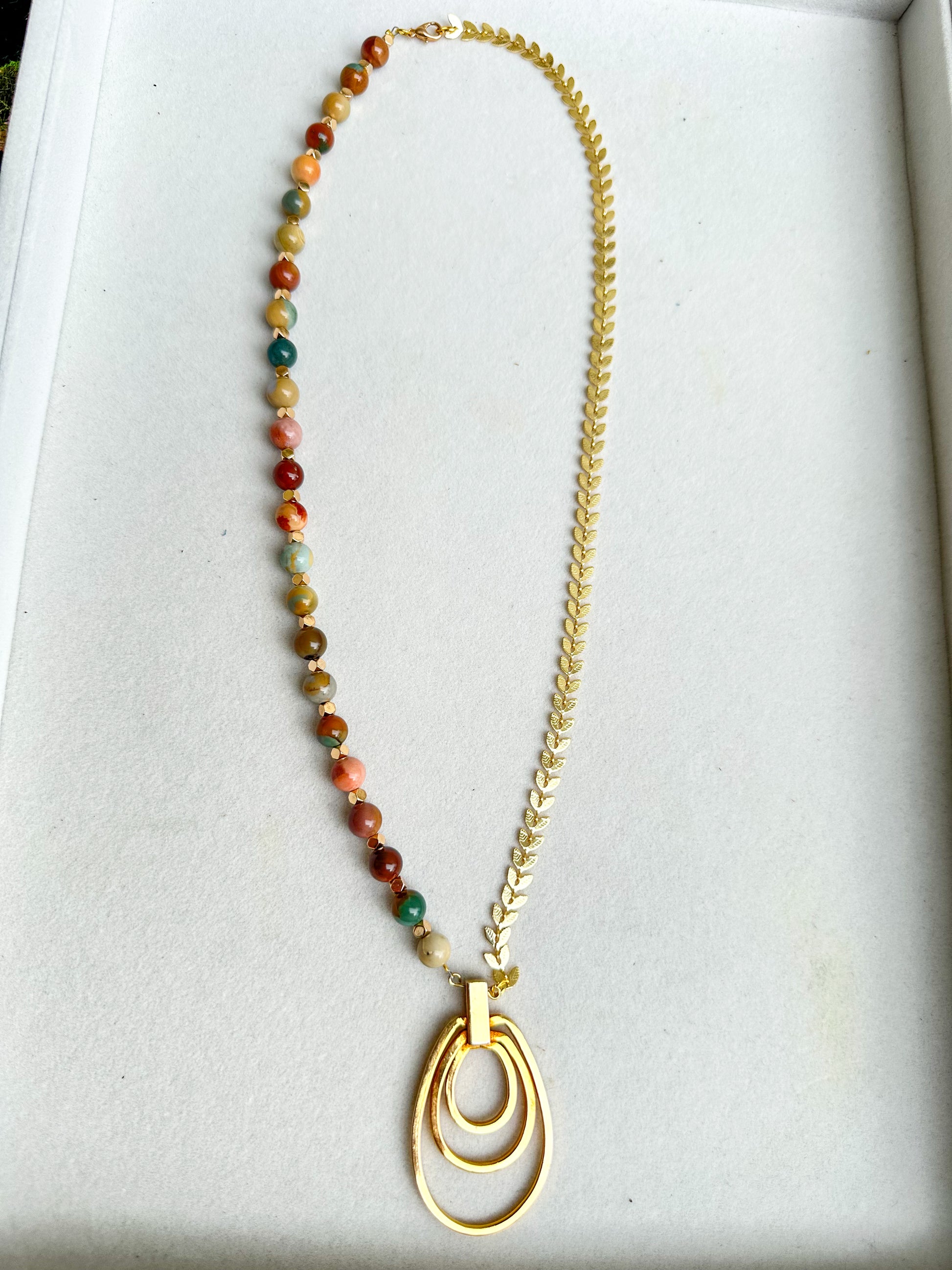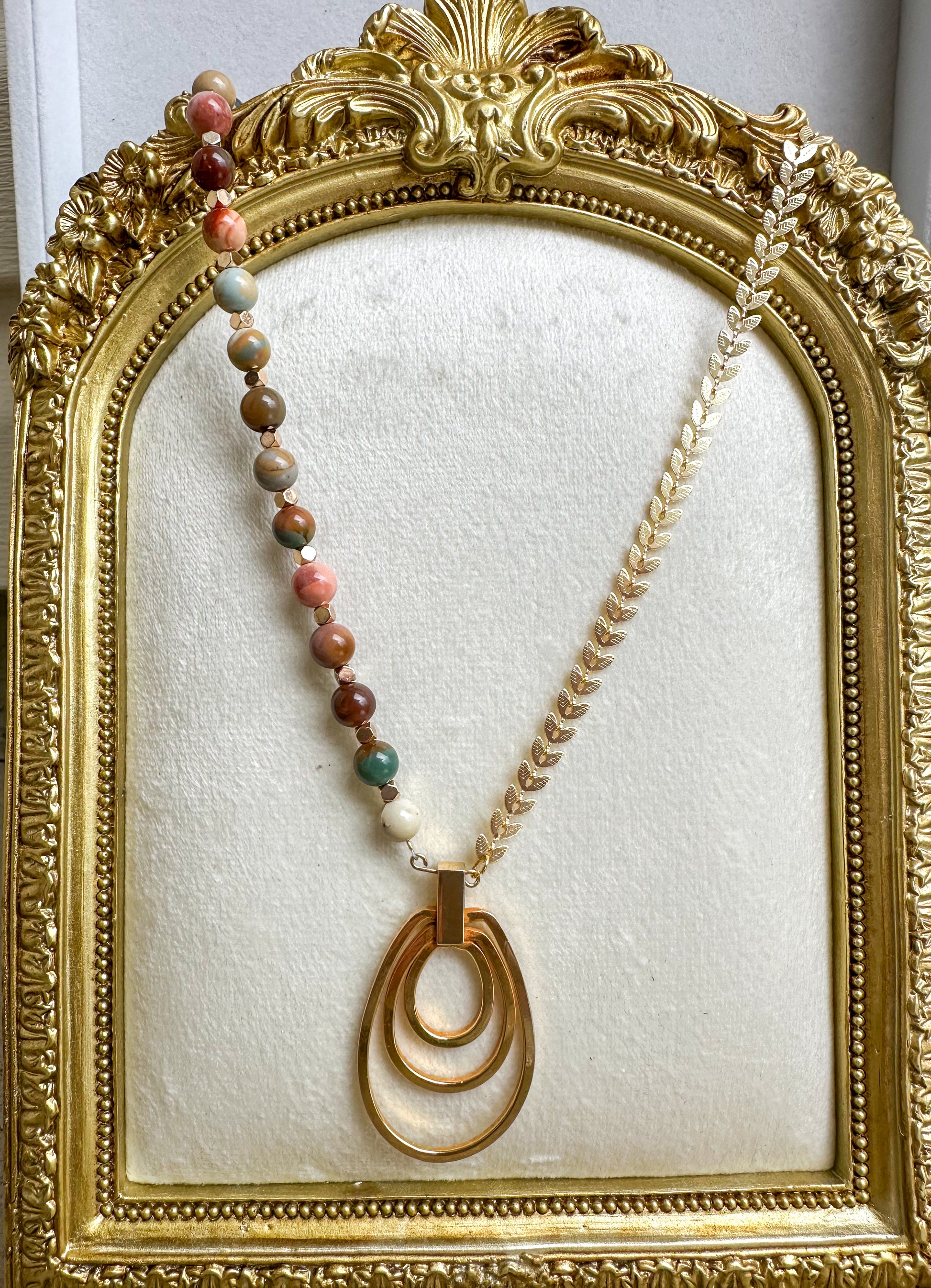 A detailed necklace of mixed gemstone beads and golden laurel chain, finished with a bold triple oval pendant.