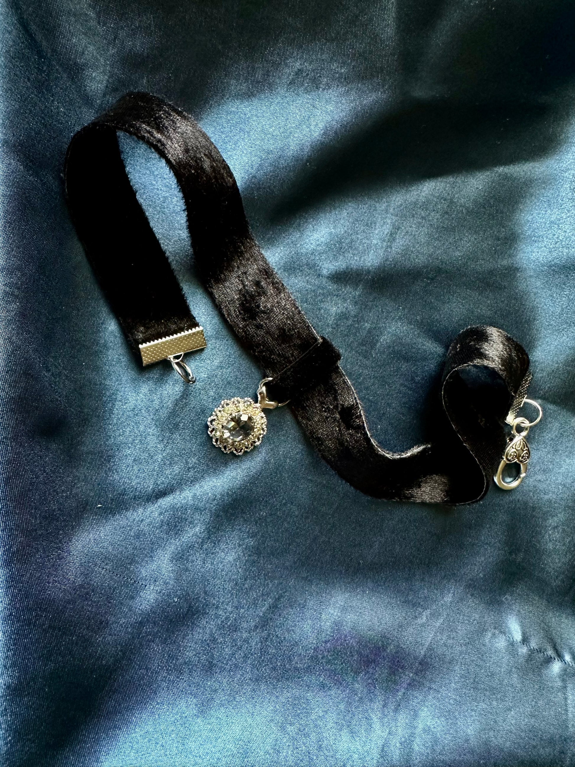 A timeless velvet choker featuring a radiant halo pendant that catches the light with every turn. Elegant and versatile, it brings just the right amount of sparkle to day or night.