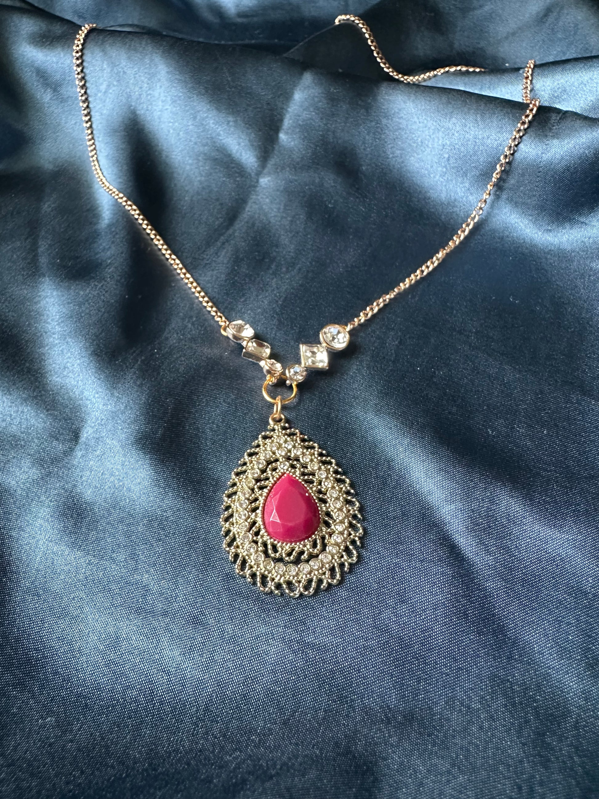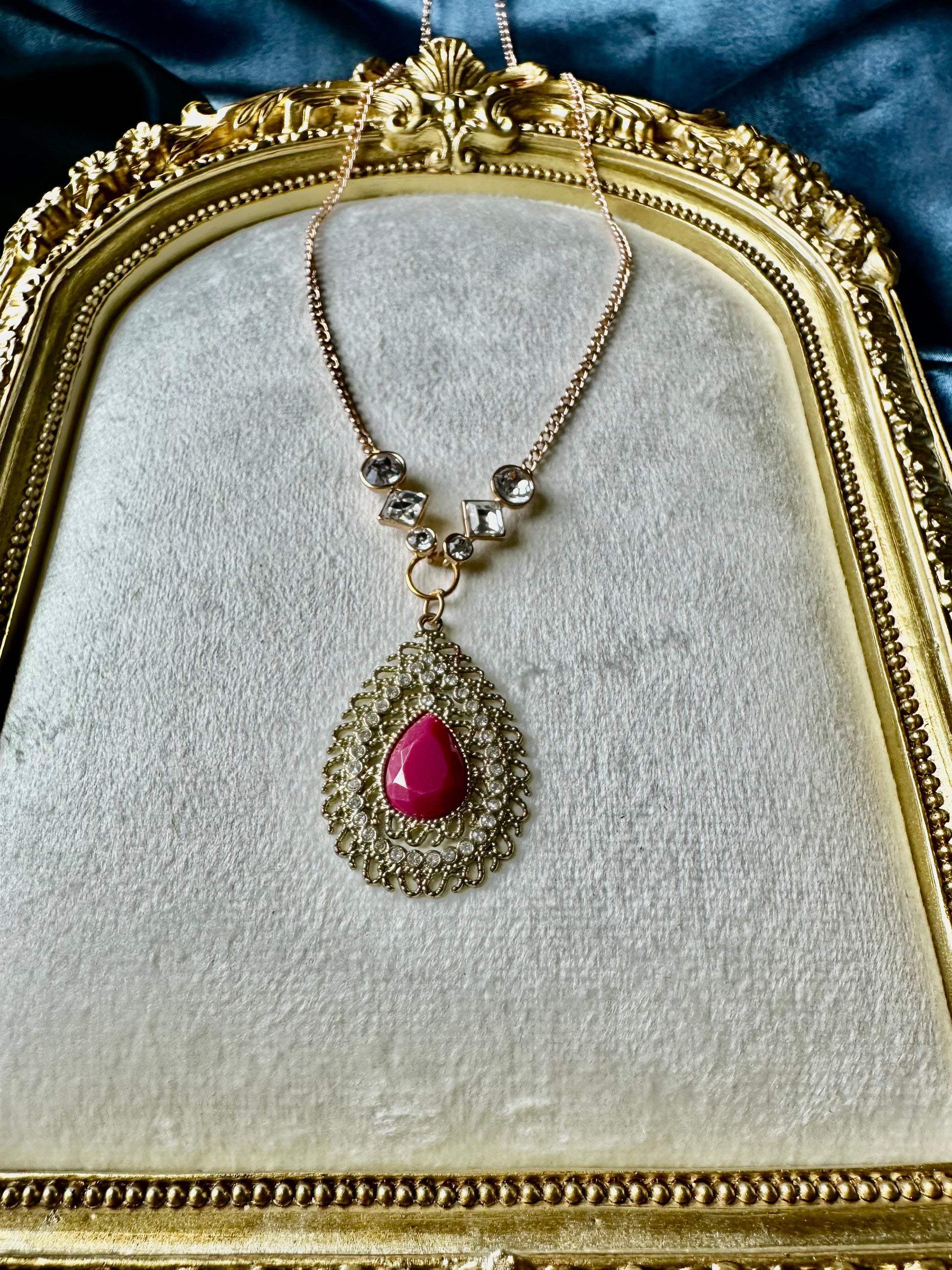 Rosé Reverie - A romantic necklace featuring a golden frame with a bold rose-hued teardrop centerpiece.
