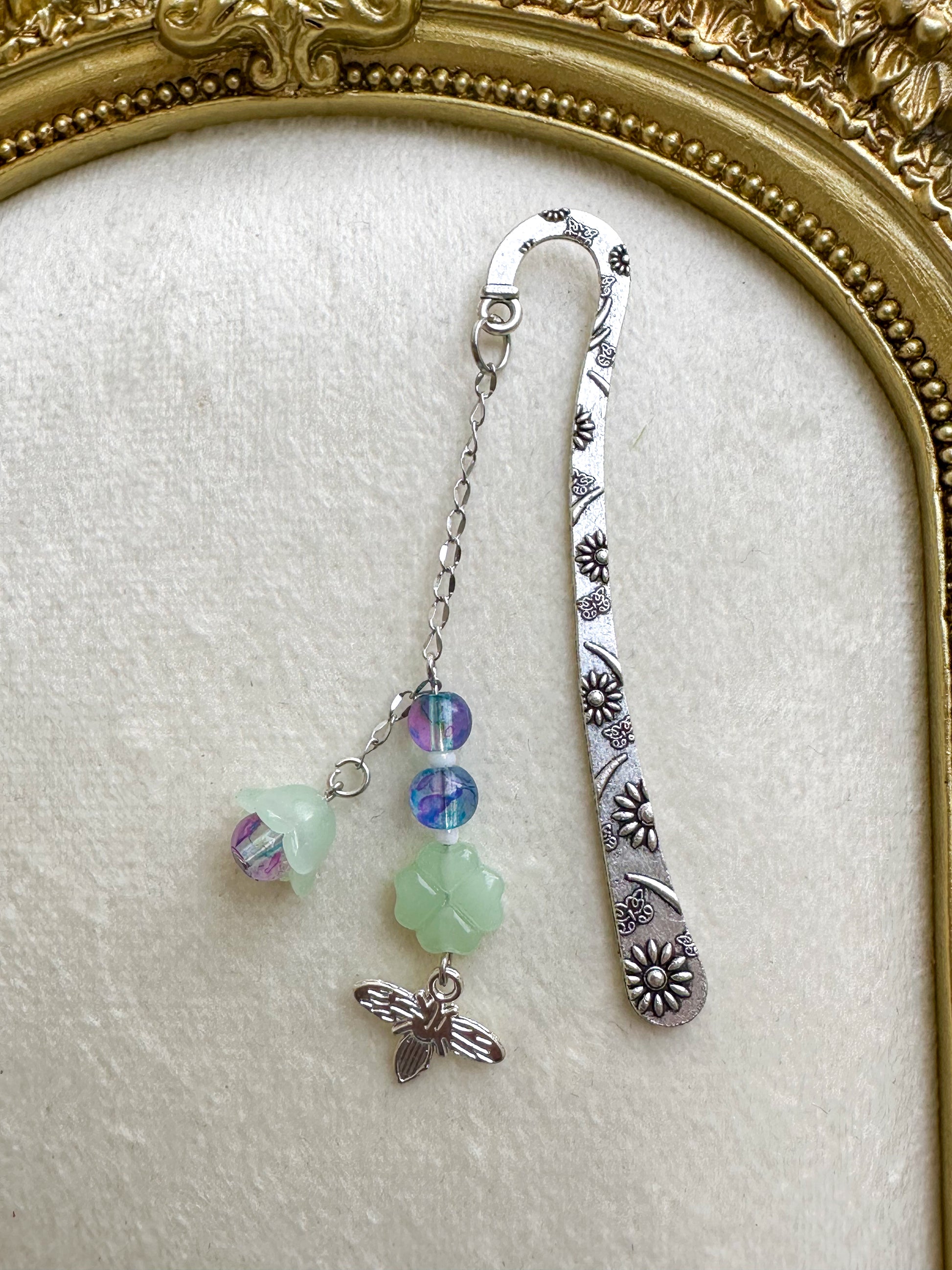 Silver floral bookmark with soft pastel beads and a tiny bee charm. A peaceful accent for your favorite read