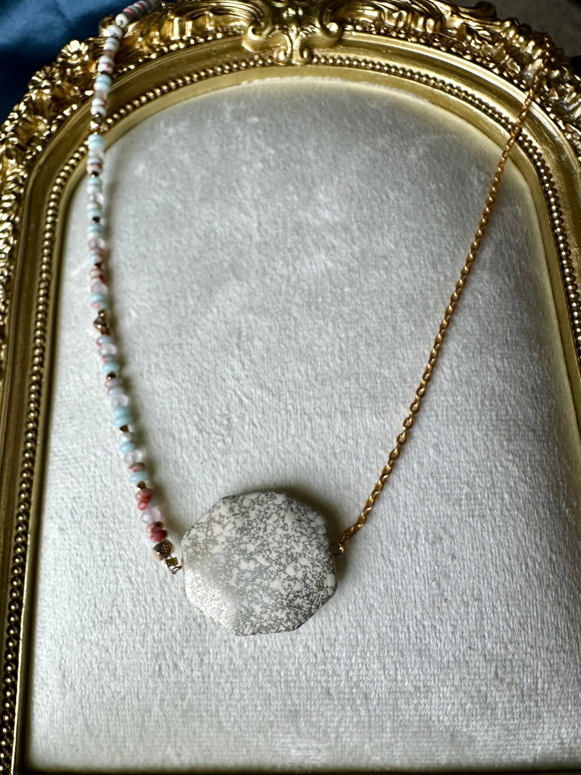Pastel gemstone beads paired with a textured silver medallion, grounding nature's changing hues.