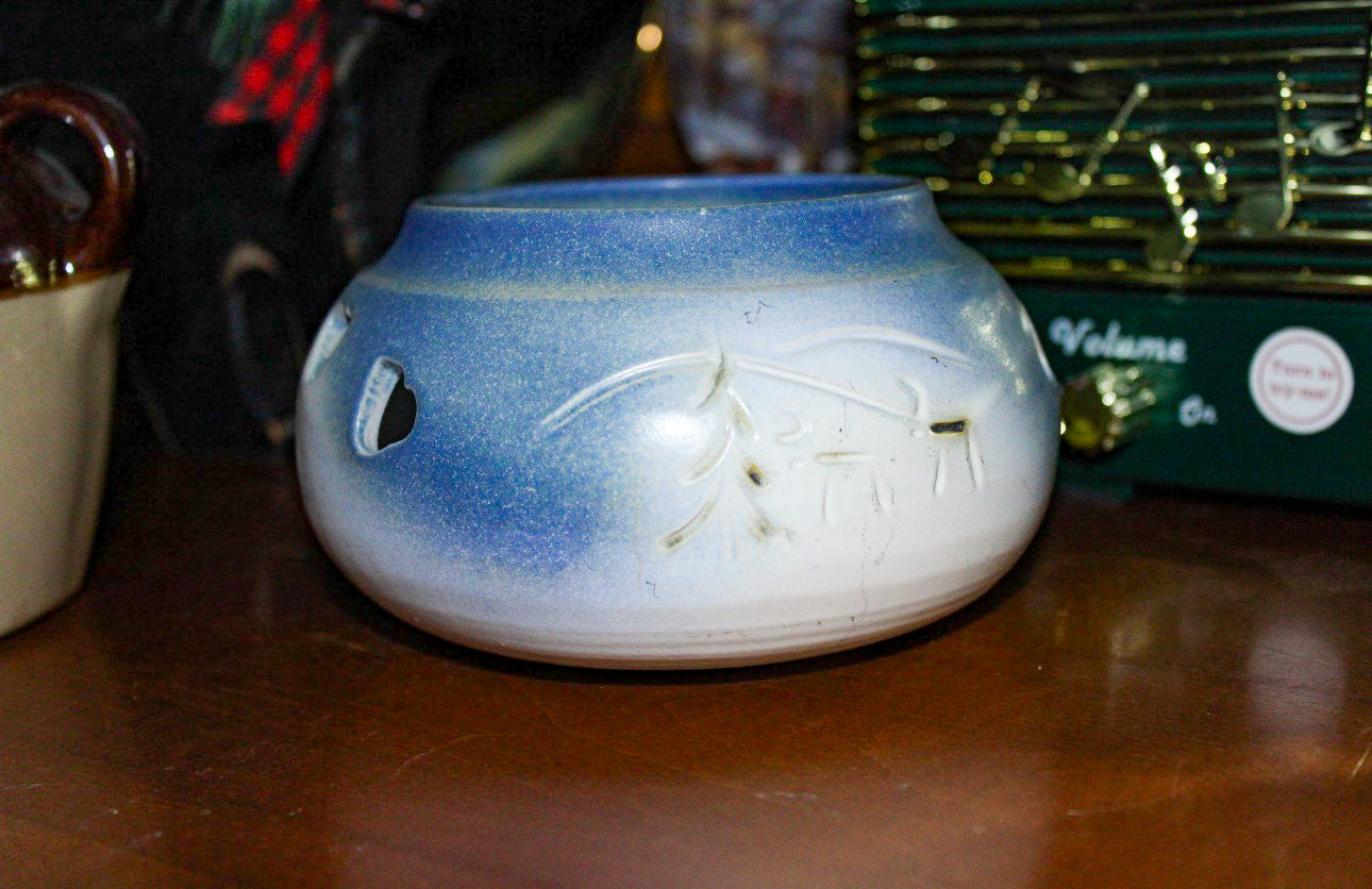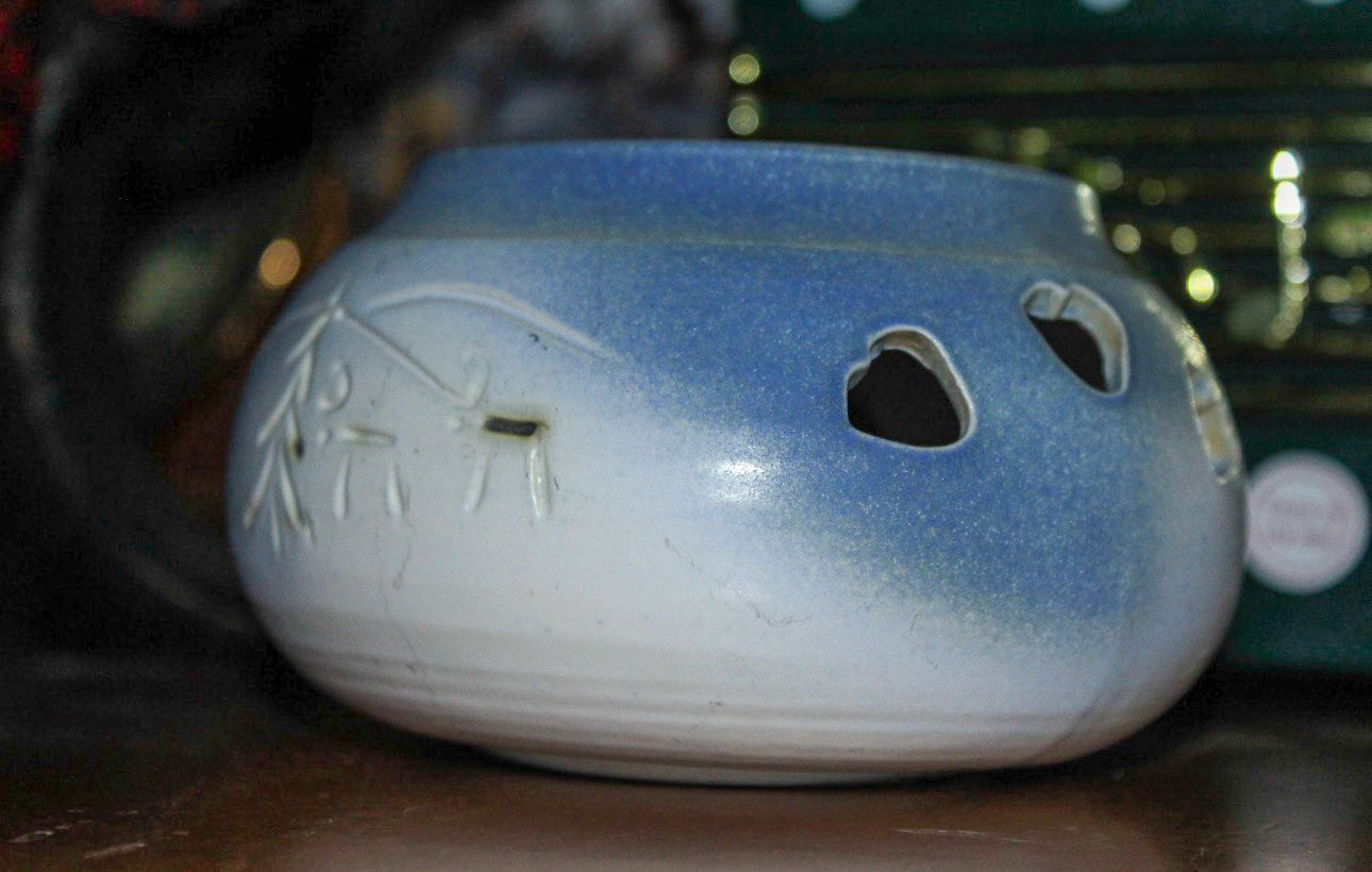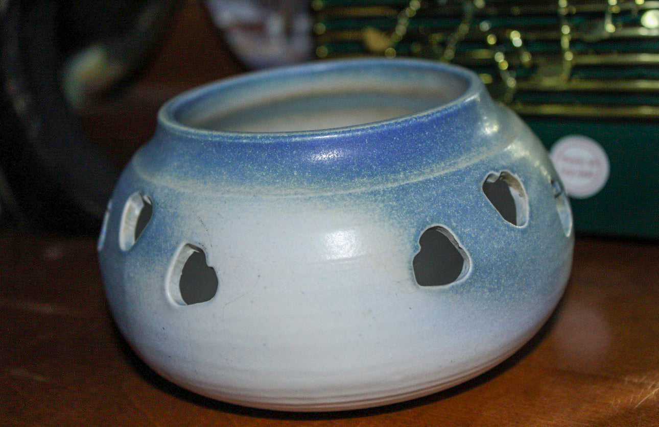 A handcrafted pottery candle holder with heart-shaped cutouts and a carved woodland scene. Its soft blue to white glaze glows beautifully when lit, creating a warm forest inspired ambiance. Perfect for cozy corners, altars, or rustic winter displays.