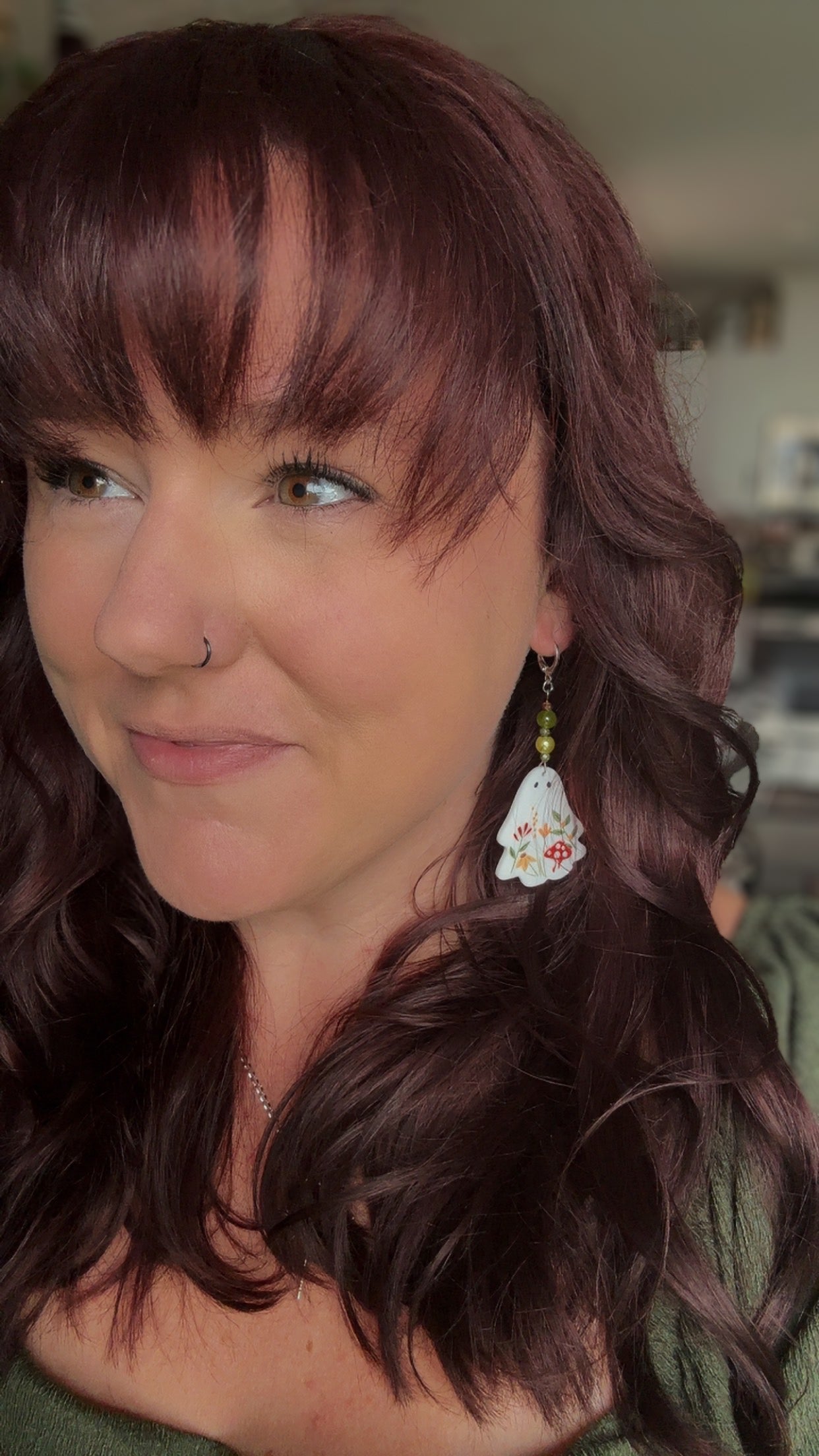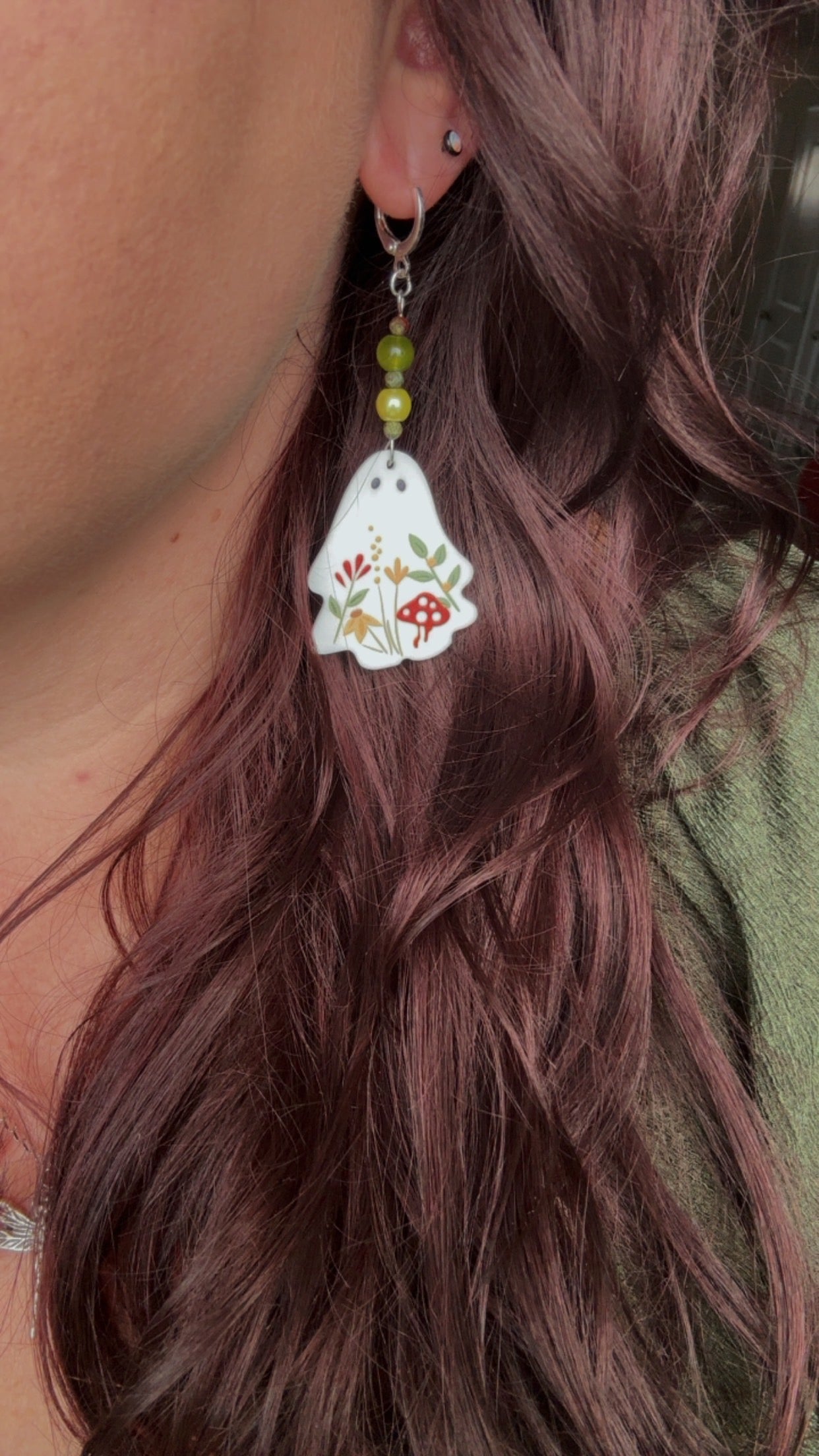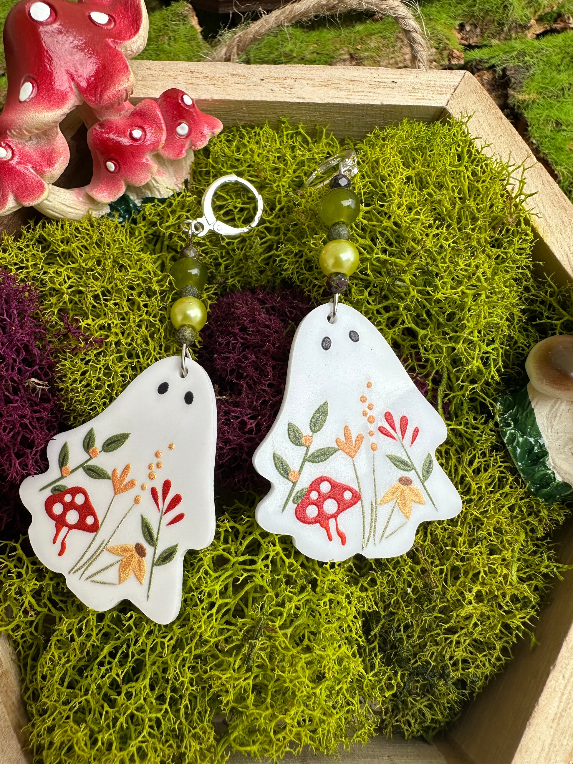 Little ghost earrings decorated with mushrooms and wildflowers, accented with green beads. A playful nod to forest spirits.